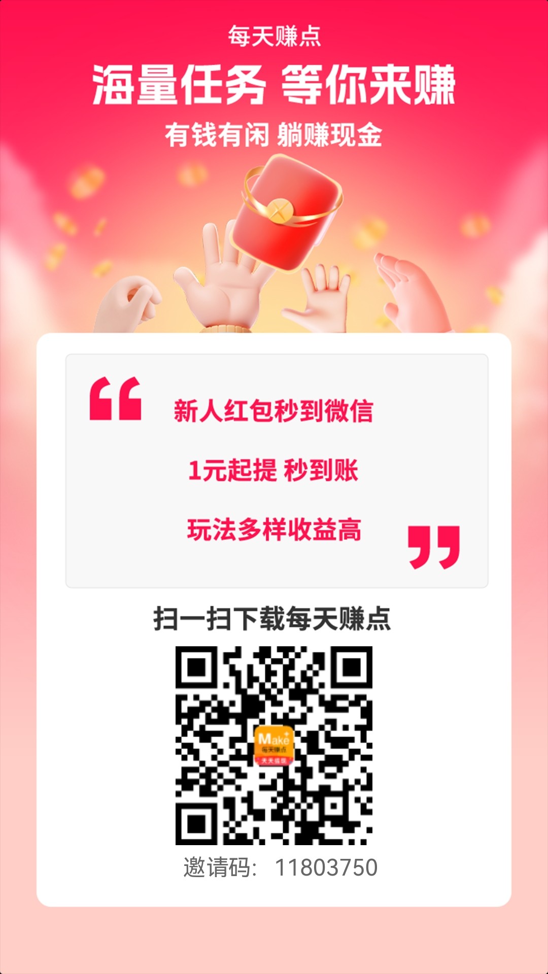 邀请好友一起加入每天赚点,通过专属收徒链接,瞬间俘获大批徒弟,好友和你都可获得现金奖励,追高可获得1000+现金奖励,赶快加入每天赚点。