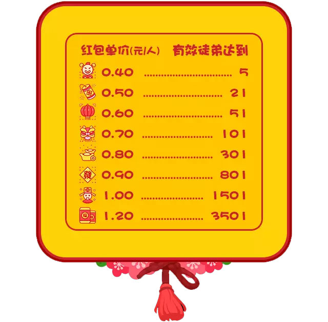 如图所示,邀请有效徒弟达到所要求数量,就能以对应的单价获得红包奖励!举两个例子: