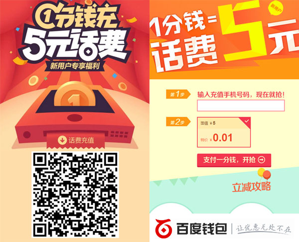 百度钱包新注册用户专享福利,只要支付1分钱(0.01元)就可以获得5元话费,支持中国移动、中国电信和中国联通的全国三网用户,赶紧来薅羊毛吧。
