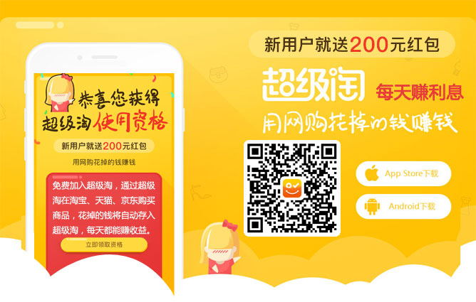 超级淘是国内首家网购消费存钱应用APP,用户只要通过超级淘在淘宝、天猫、京东等各大购物平台上购物,消费的金额就能存入超级淘,一直累积,每天拿利息!那些每年消费上万的网购达人们,你用超级淘赚的利息,可能变成一台iPhone7。
