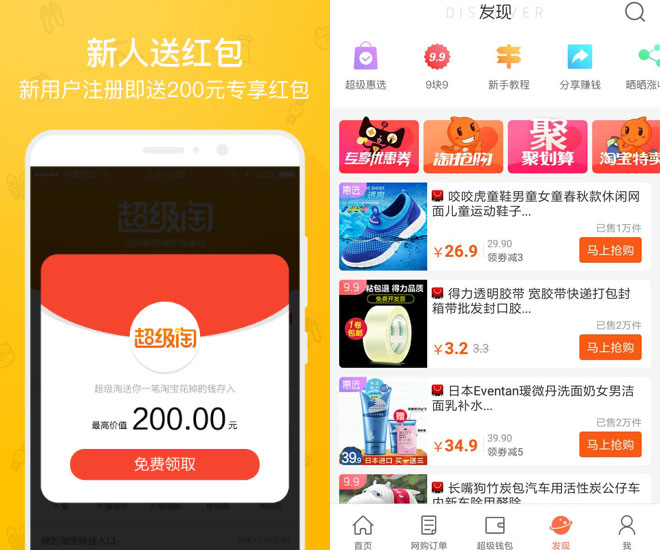 超级淘的“发现”频道是其中一个很有特色的栏目,“超级惠选”、“9块9”两大优惠通道,集结了大量优质商家的优质商品,让你用白菜价都能买到物美价廉的商品。