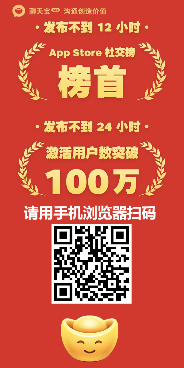 聊天宝 App 1.0 版本发布不到 24 小时,激活用户数已突破 100 万。聊天宝,沟通创造价值。发布不到12小时登顶App Store社交榜首。上来聊天宝天天都有红包拿。聊天宝是一款可以获得奖励的聊天软件,这里有随处可见的奖励机制,聊天、看新闻、邀请好友、购物,都能获得奖励。同时,聊天宝也是一款超高效率的即时通讯应用,针对查看、发送及处理消息都做了大量优化,可以实现更高效的沟通。