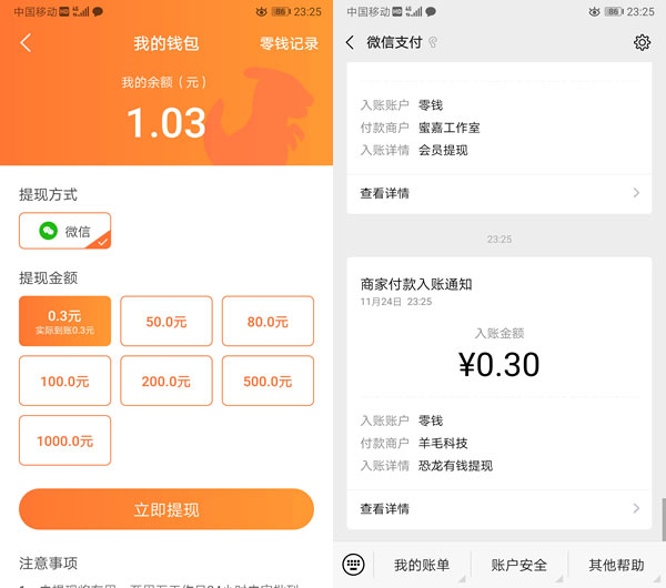 4、提现制度:微信提现,0.3元可提,手续费3%,24小时之内到账