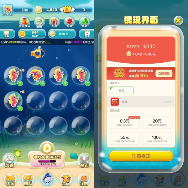 金币购买鱼,同等级鱼进行合成晋升更高级的鱼,在合成升级的过程中,每次达到新的最高级别将会获得珍珠奖励(珍珠用于提现)。鱼升级到 38 级时可随机获得龙财神,红包鱼,情侣鱼,金币鱼等高价值鱼。