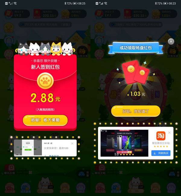 新人登录疯狂合猫猫APP签到送2.88元红包,同时新人专享7天小额提现特权,每天可提0.3元以上,微信秒到账。疯狂合猫猫虽然游戏老套,但平台诚意十足,可以简单零撸。