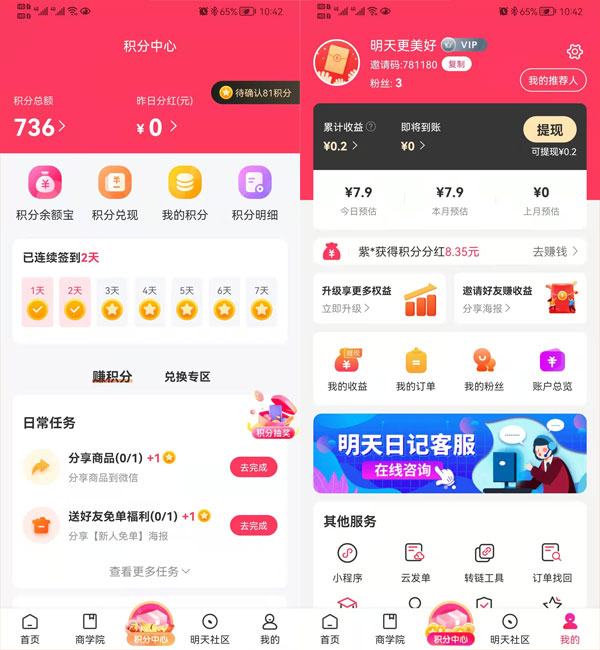 明天日记最近挺火的,打着社交电商的旗号,玩这个的人呢号称月入几万。不知道是不是真的。今天就带大家一探究竟!明天日记app是一款社交电商导购平台,在里面进行淘宝京东拼多多的购物不光可以领取优惠券还有额外的佣金,同时叫外卖充值话费有能省钱;其实,除此之外同样可以用来撸个羊毛。